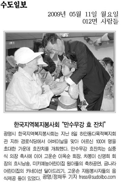 2009어버이날 기념 "만수무강 효잔치" 성료 페이지 정보 작성자 최고관리자 댓글 0건 조회 6,208회 작성일 09-05-11 00:00 본문 2009어버이날 기념 "만수무강 효잔치" 성료 목록 이전글2009 어버이날 기념" 제9회 어버이 효사랑 푸드뱅크 나눔마당" 09.05.11 다음글2009 행복+사랑÷ 바자회 성료 09.04.27