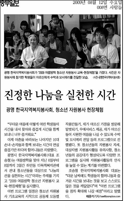 2009년 여름방학 청소년 자원봉사현장체험 페이지 정보 작성자 최고관리자 댓글 0건 조회 6,868회 작성일 09-08-13 00:00 본문 2009년 여름방학 청소년 자원봉사현장체험 목록 이전글사랑나눔을 실천하는 한국지역복지봉사회 09.09.23 다음글광명푸드마켓 개소식2 09.06.10