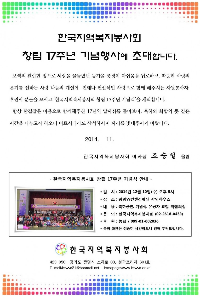 한국지역복지봉사회 창립 17주년 기념식에 초대합니다