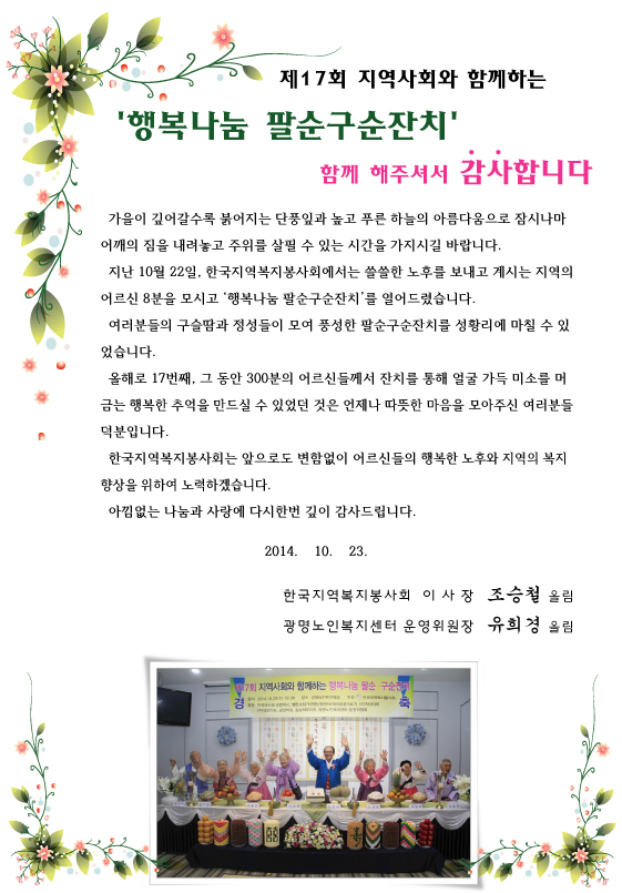 '행복나눔 팔순구순잔치' 페이지 정보 작성자 한국지역복지봉사회 댓글 0건 조회 13,568회 작성일 14-10-23 00:00 본문 어르신들의 행복을 더할 수 있도록 함께해주신 후원자 여러분과 자원봉사자 여러분들께 감사드립니다. 목록 이전글한국지역복지봉사회 창립 17주년 기념식에 초대합니다 14.11.17 다음글제17회 지역사회와 함께하는 '행복나눔 팔순구순잔치' 14.10.08