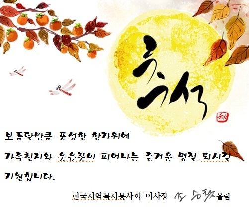 풍요로운 한가위되세요~ 페이지 정보 작성자 한국지역복지봉사회 댓글 0건 조회 13,669회 작성일 15-09-25 00:00 본문 풍요로운 한가위되세요~ 목록 이전글방과후 행복교실 신청 안내 15.10.02 다음글2015년 청소년 자원봉사 교육현장체험 참가 안내 15.07.09
