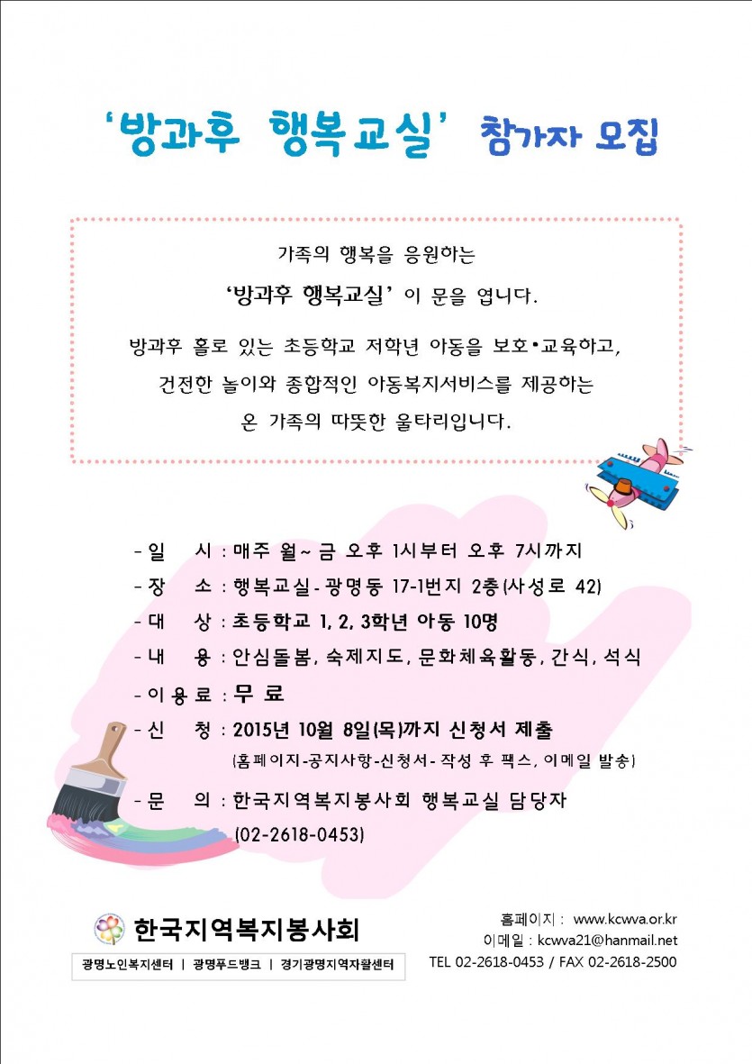 * 2015년 10월 8일(목) 오후 6시 신청 마감 후 우선순위(저소득가정, 한부모가정, 조손가정, 맞벌이가정, 등)를 적용하여 최종 선정합니다.