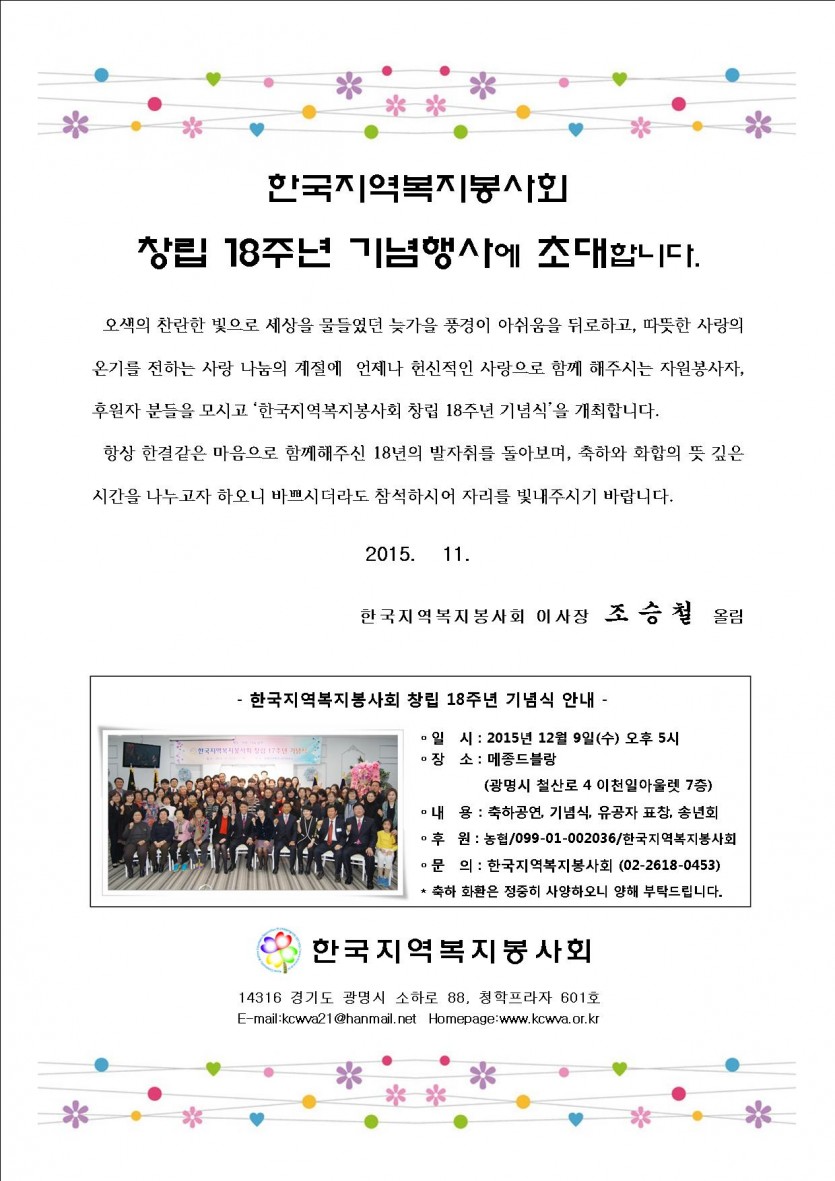 창립 18주년 기념식에 초대합니다 페이지 정보 작성자 한국지역복지봉사회 댓글 0건 조회 13,615회 작성일 15-12-07 00:00 본문 뜻깊은 자리에 함께해 주세요~ 목록 이전글새해 인사드립니다 15.12.31 다음글행복나눔 팔순구순잔치 15.10.29