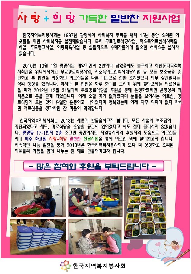 밑반찬지원사업 실시 페이지 정보 작성자 한국지역복지봉사회 댓글 0건 조회 15,240회 작성일 13-01-09 00:00 본문 독거어르신들을 위한 밑반찬 전달사업 모금함< http://t.co/zBBE0NVdkM > 목록 이전글광명노인복지센터 '방문요양' 13.01.11 다음글창립 15주년 기념식 및 제14회 자원봉사대축제에 초대합니다 12.11.23